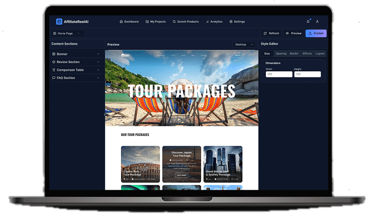 Whether you start with a product keyword, a niche idea, or an affiliate link, AffiliateReelAI transforms your input into a fully-structured site with review pages, comparisons, videos, and more—ready to go live instantly.