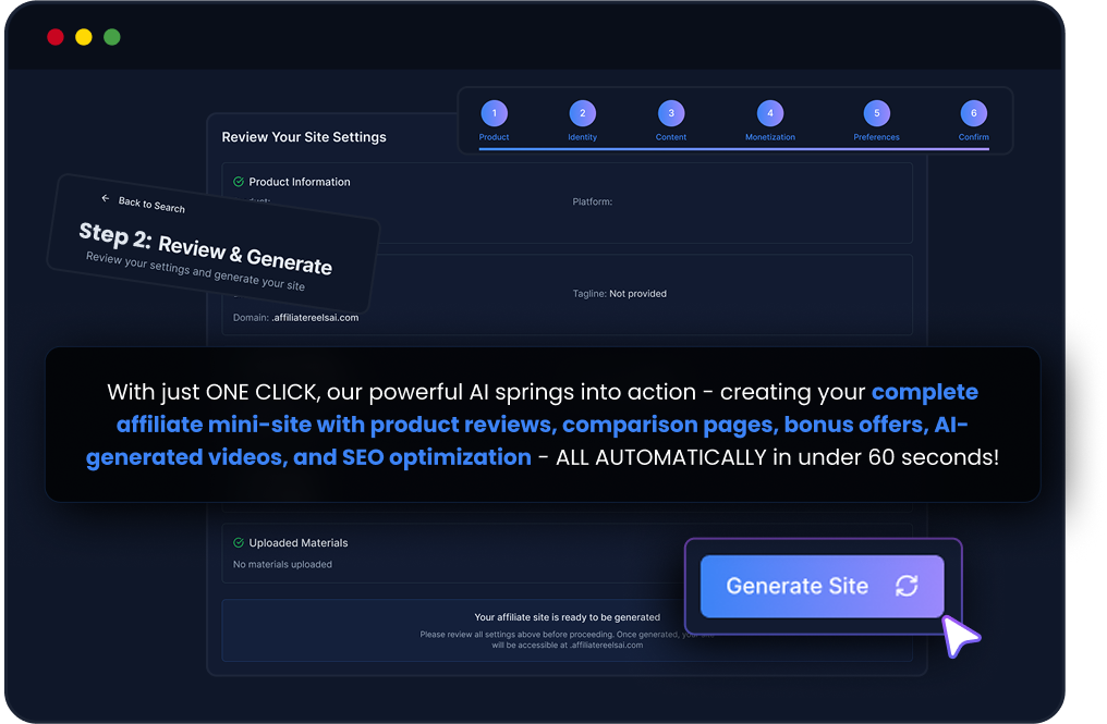 Immediately, your mini-site begins filling with engaging content - detailed product reviews, comparison tables, buyer guides, and persuasive videos that drive visitors toward your affiliate links.