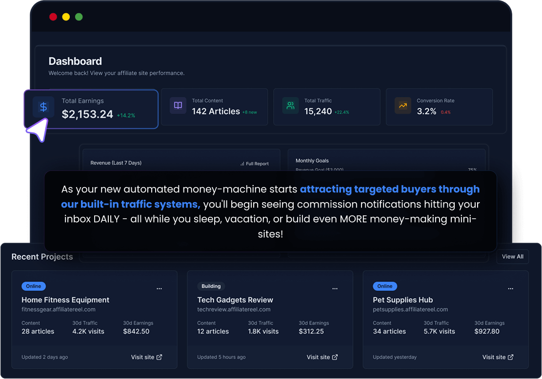 Your AI-powered sites promote affiliate offers, highlight special deals, and implement proven conversion strategies, encouraging visitors to purchase through your links without you lifting a finger.